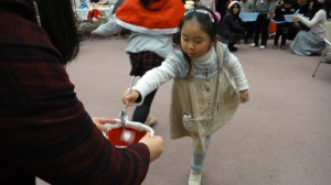 開始を待つ子供達。いつでもスタートできそうです。 お菓子を運んでくる子供達を待つ中高生達。少々