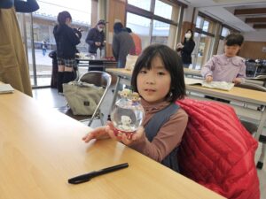 またスノードーム作りでは、持参したオーナメントを使いオリジナルのスノードームを作ることができました♪